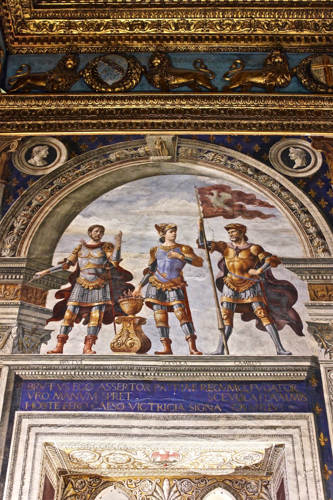 The lunettes at the two sides of the central scene represent: Brutus, Mutius, Scævola on the left and Decius, Scipio, Cicero on the right.